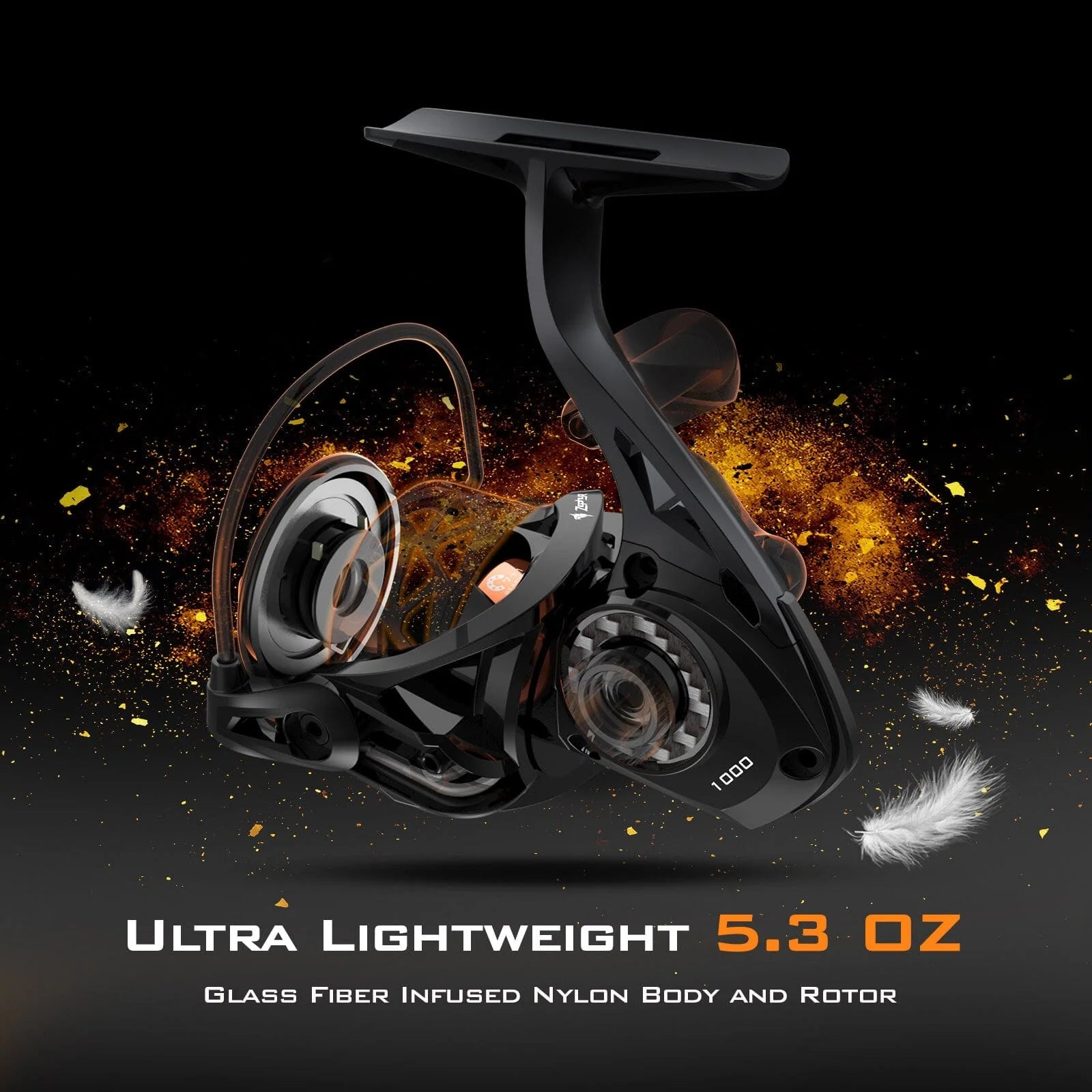 The KastKing Zephyr 1000 features an oversized 7075-T6 aluminum alloy mainshaft that is exceptionally strong and incredibly lightweight. And the manganese brass pinion gear and a satin smooth triple-disc carbon fiber drag system with up to 10 lbs of drag power lets you fish the lightest fishing lines without the worry of breakoffs.
