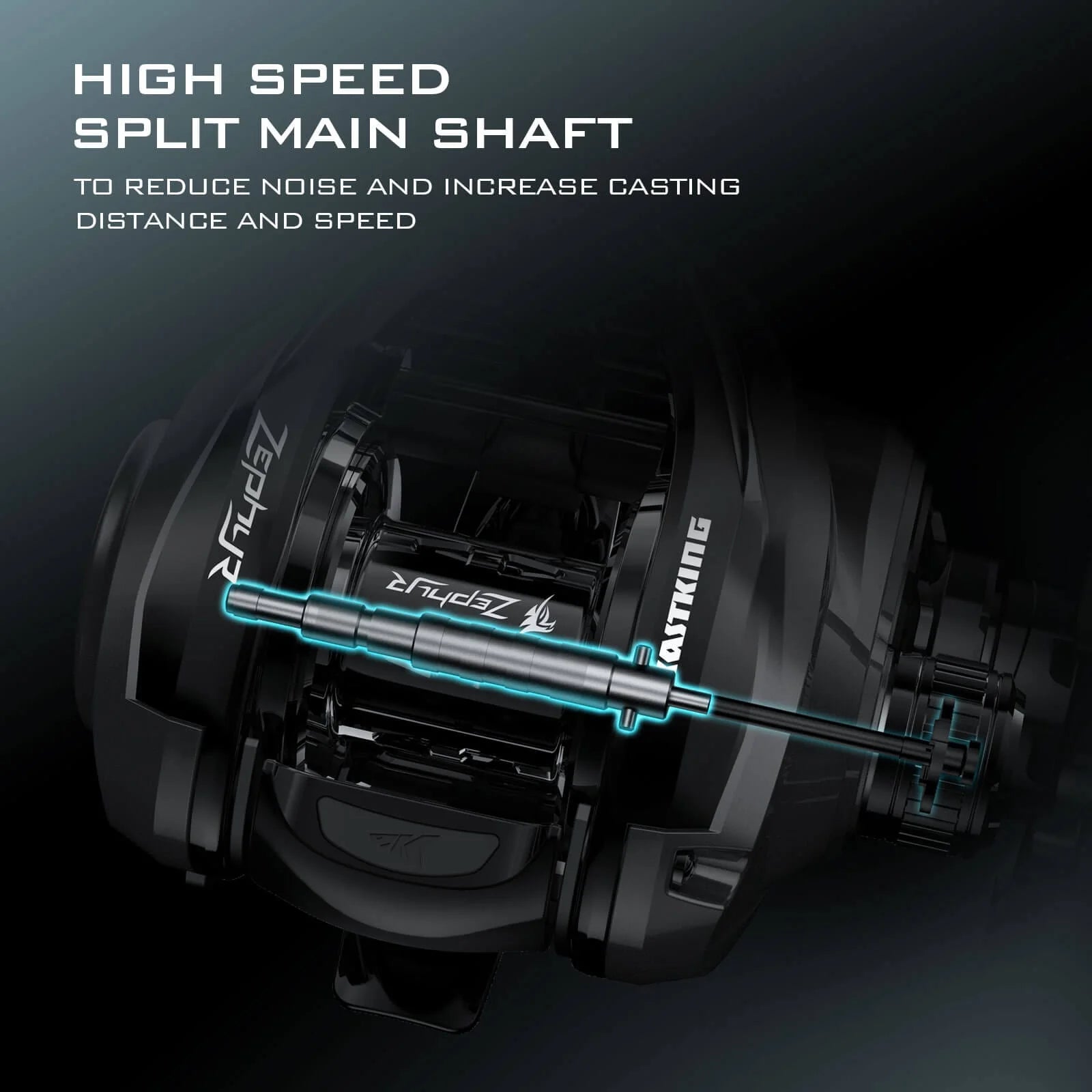 Inside the Zephyr baitcasting reels are 7+1 double-shielded stainless steel ball bearings to ensure ultra-smooth retrieves. And the double bearing supported pinion gear is 35% smoother under load and 30% more durable. Zephyr baitcaster fishing reel is also fast with a 7.2:1 gear ratio and is built to last with brass main and pinion gears, as well as a brass main gear shaft. The high-speed split main shaft reduces noise and increases casting distance and speed.