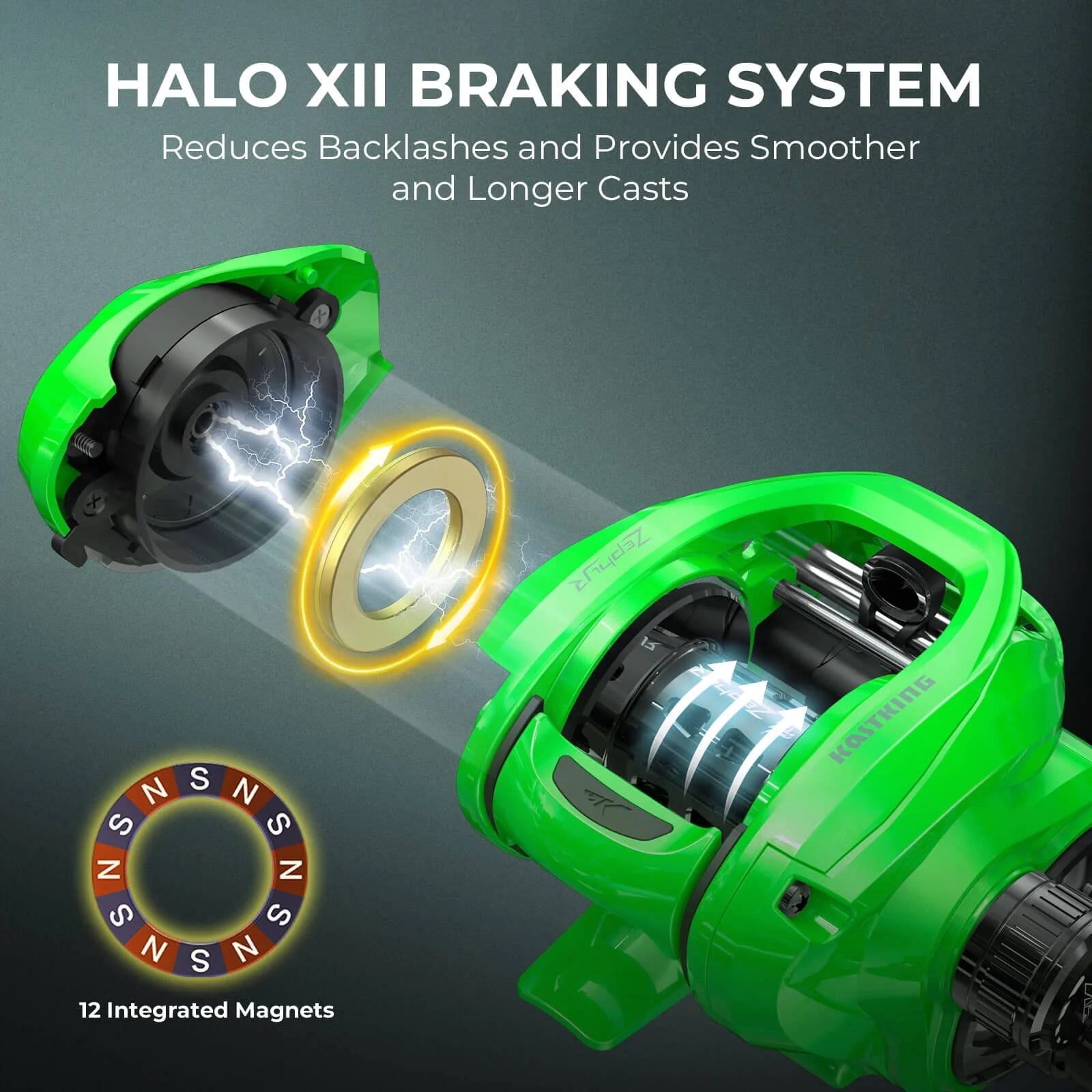The KastKing Zephyr Baitcasting Reel boasts a 7.2:1 high-speed gear ratio, 7+1 MaxiDur double-shielded stainless steel ball bearings.