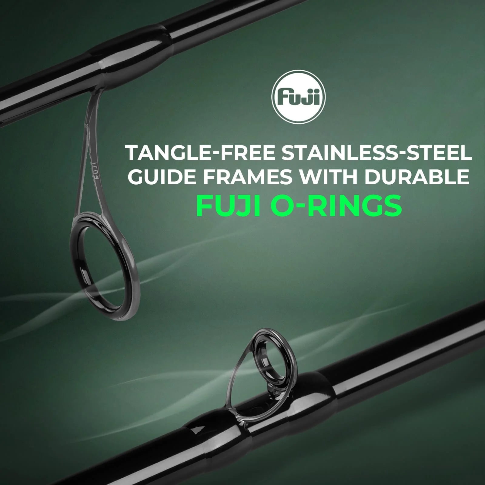 Finished with high-quality, durable Fuji O-ring guide, the fishing rods delivery smooth and efficient line passage with minimal friction. The 360-degree protection reduces wear and tear, minimizes the risk of tangles, guaranteeing reliable performance with all line types, braid/mono/fluorocarbon.