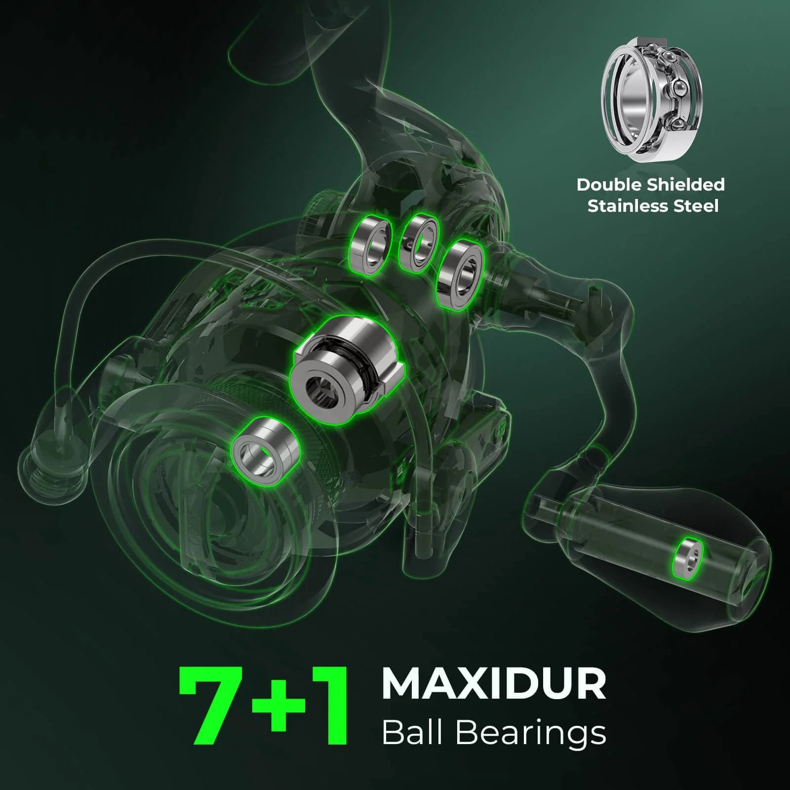 The KastKing Zephyr Spinning Reel features 7+1 MaxiDur double-shielded stainless steel ball bearings, precision machined high-alloy and brass gears, up to 22 lbs of carbon fiber drag, and corrosion-free glass fiber-infused frame with an aerodynamic asymmetric rotor. Weighing only 7.2oz, it's the ideal spinning reel for discerning anglers.