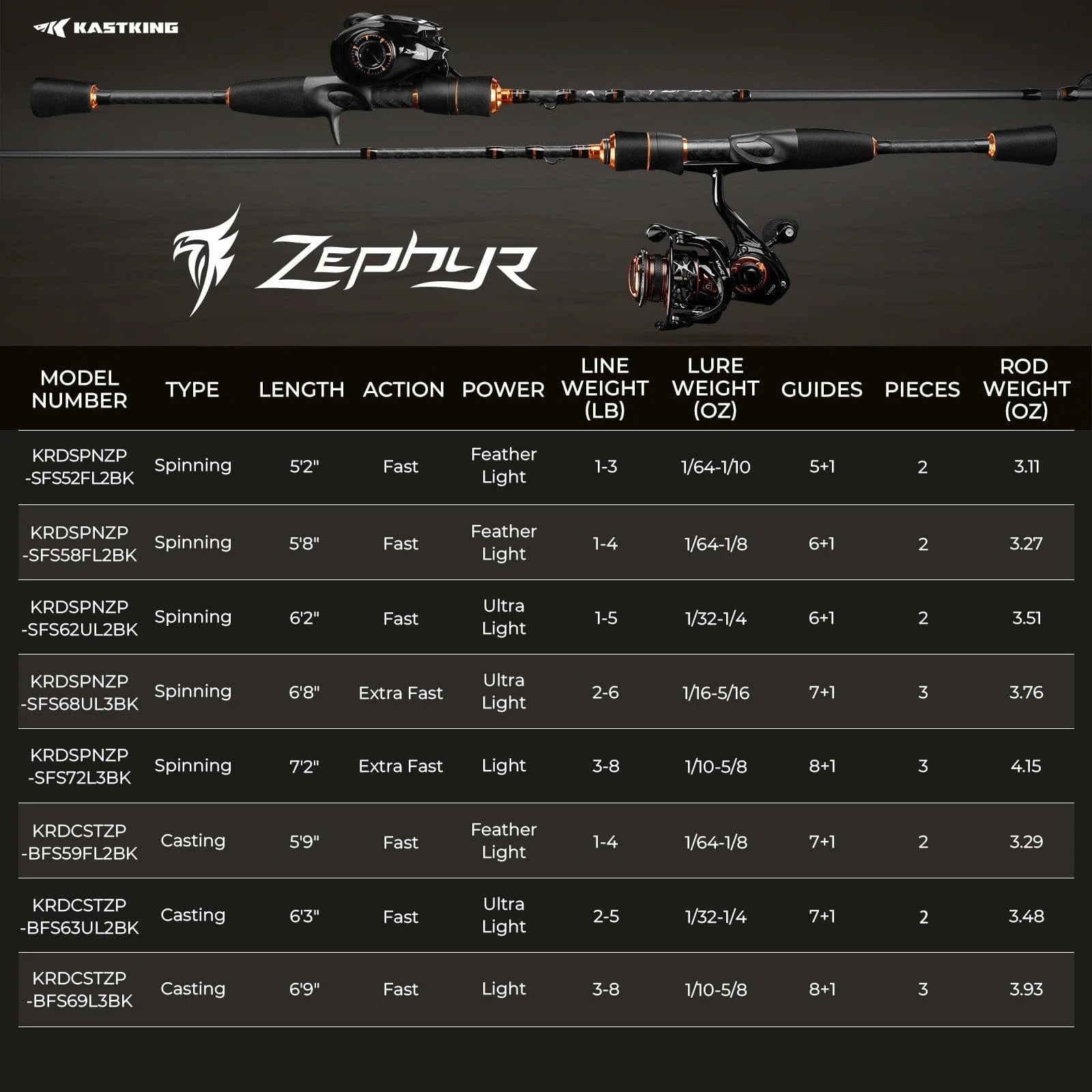 Crafted with KastFlex IM6 Graphite Blanks, the KastKing Zephyr Spin Finesse fishing Rod strikes the perfect balance of lightweight performance, superior sensitivity, and enhanced durability. This advanced construction enables anglers to detect even the slightest bites, while offering precise control and responsiveness for ultra-light tackle.