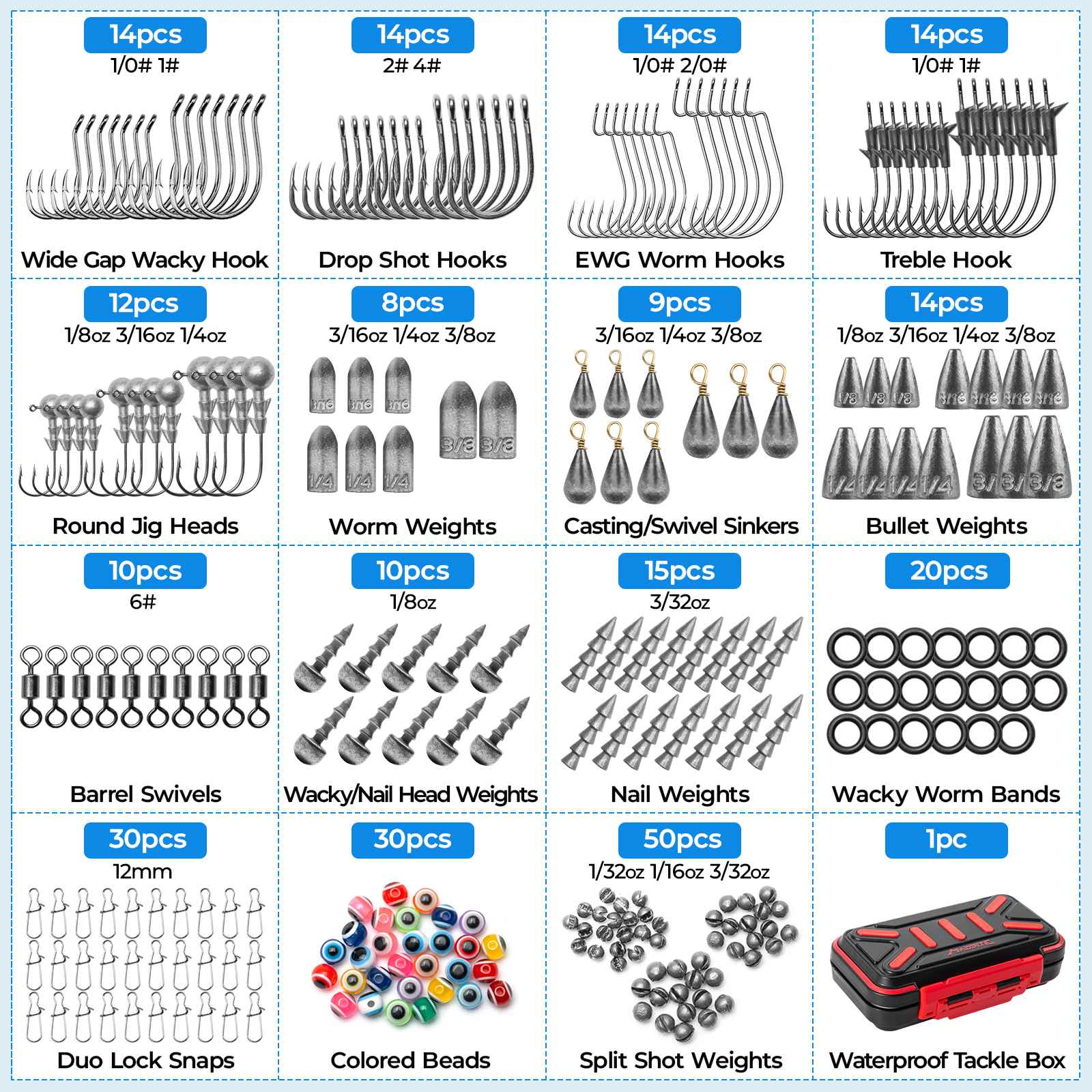 Equipped with five premium hook styles—EWG Worm Hooks, Round Bend Worm Hooks, Wide Gap Wacky Hooks, Light Wire Finesse Hooks, and Drop Shot Hooks—each with needle-point sharpness and bait-retaining features for better hookup ratios and longer-lasting presentations. Includes 2 styles of dual bait keeper jig heads to reduce bait wear and slippage.