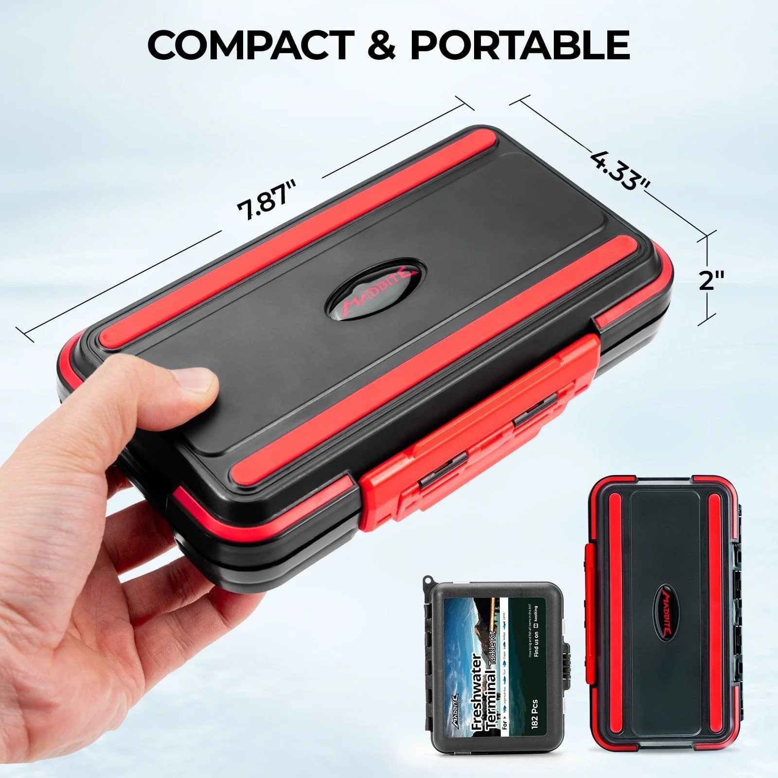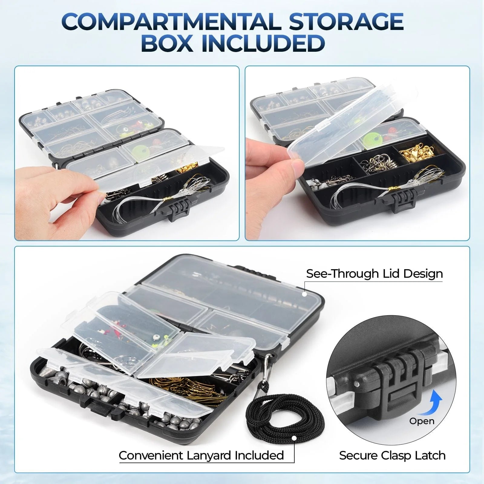 Housed in a 7.87" x 4.33" x 2" tackle box with watertight seal, adjustable dividers, and a secure double-lock buckle. The see-through lid allows for quick gear checks, while compartmental dividers keep tackle neatly organized. Lay flat before opening to avoid spills—perfect for easy carrying in backpacks or boats.
